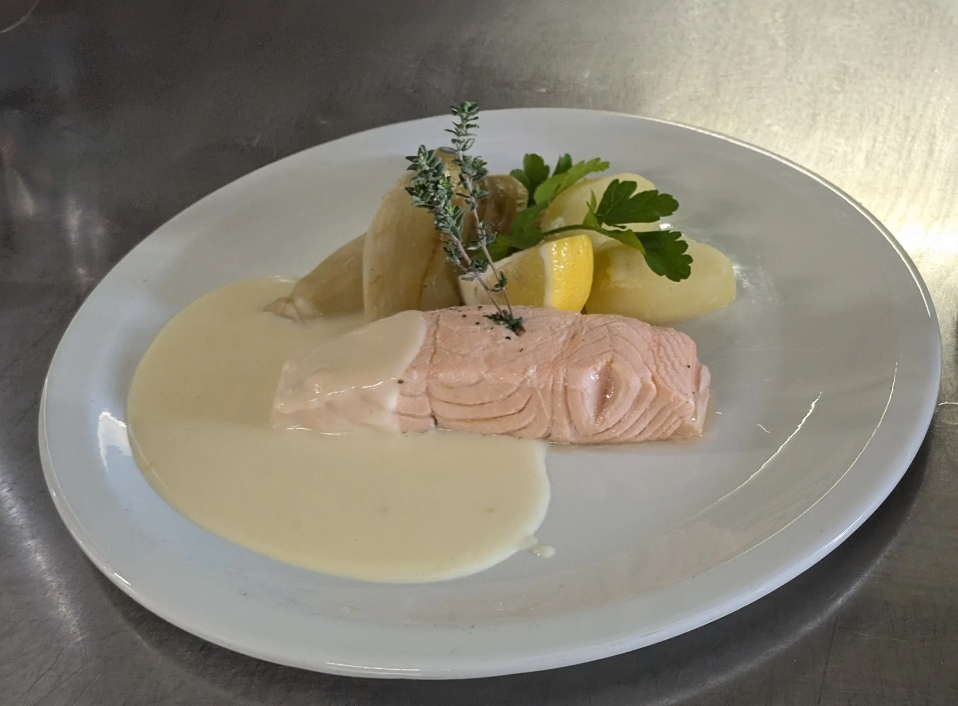 Saumon poché, sauce vin blanc. Purée de pommes de terre et fondue de poireaux