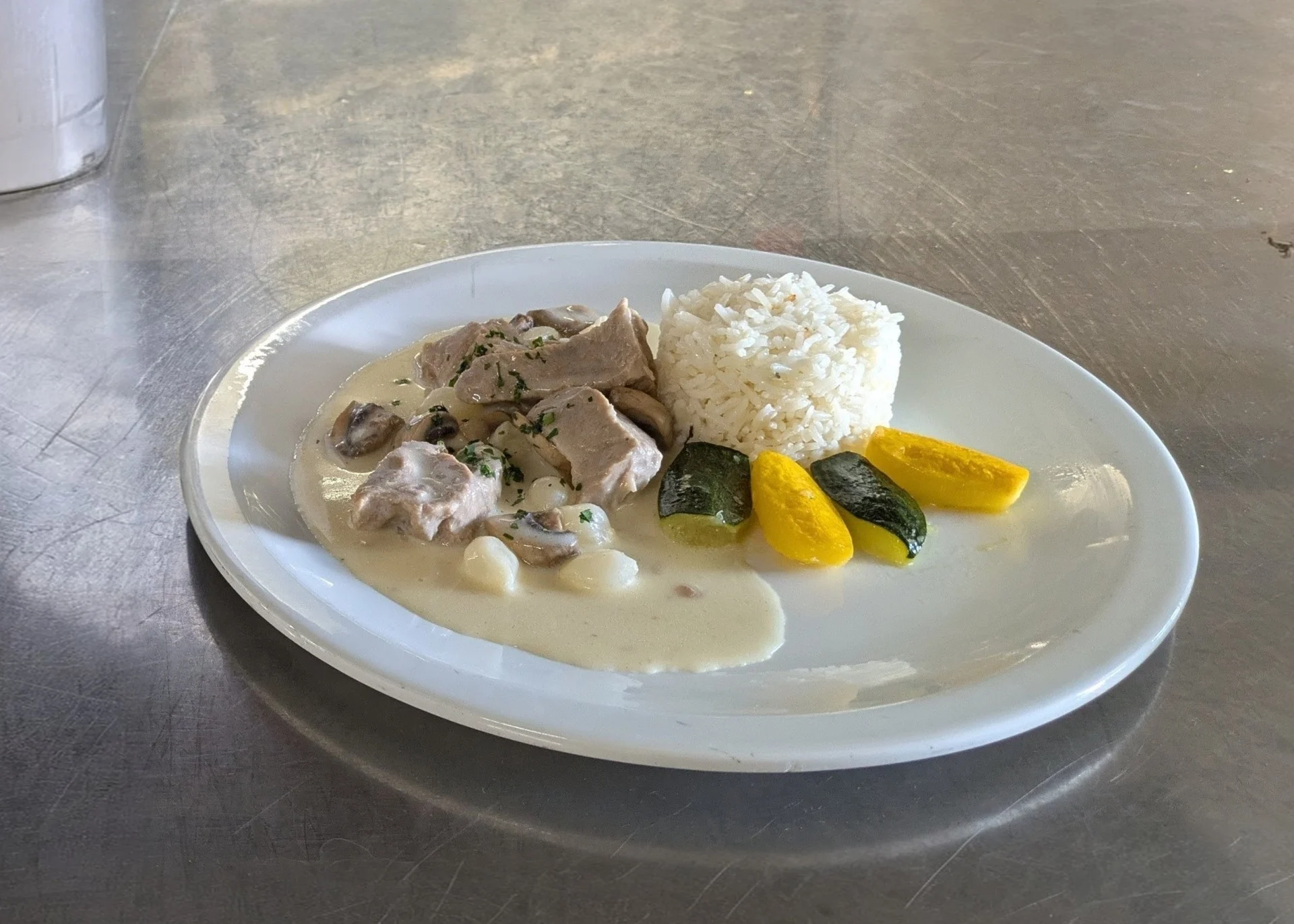 Blanquette de veau à l'ancienne, riz pilaf de Camargue et courgettes glacées.